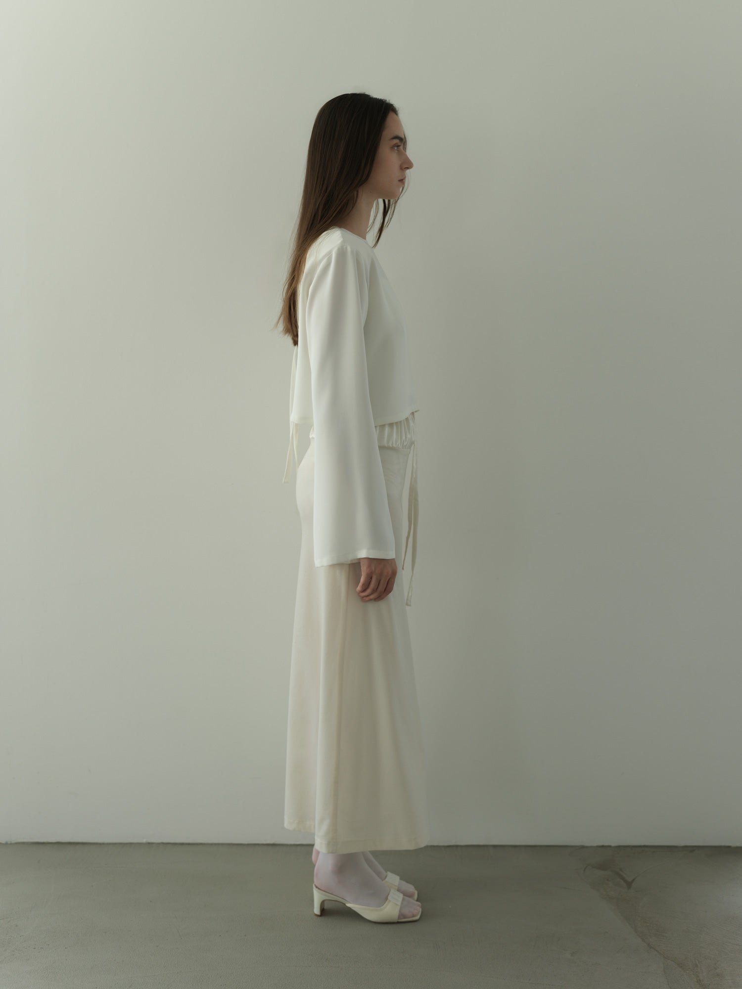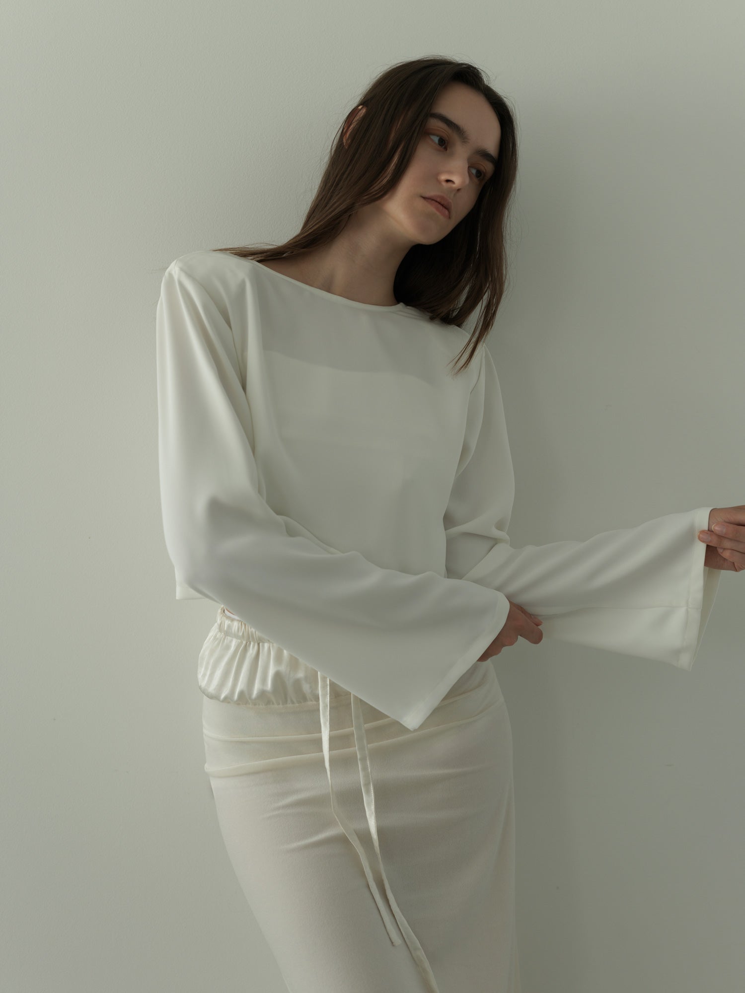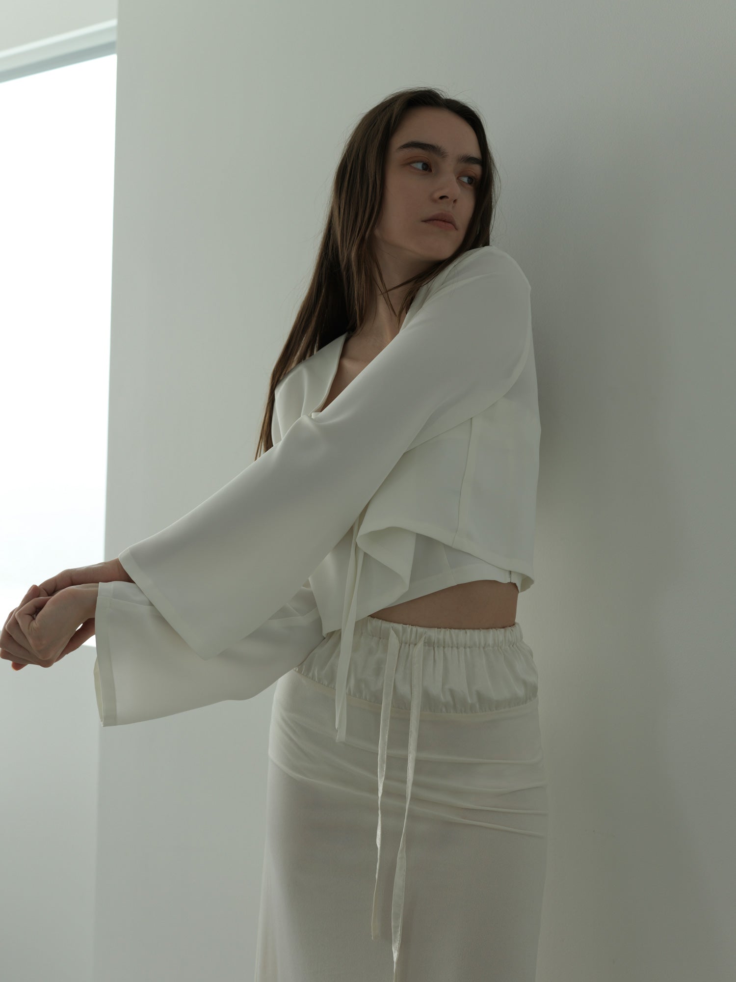マットな質感の上質なサテンを使用し、さらっとした着心地のブラウスです。RAW STUDIO定番の深めのVネックは前にして着ることはもちろん、後ろをVネックにして着ることもできる2way仕様。袖はベルスリーブのように袖口が広がったシルエットなのもポイントです。取り外し可能な肩パッドが付属されているので、肩のラインも気分にあわせて調整いただけます。