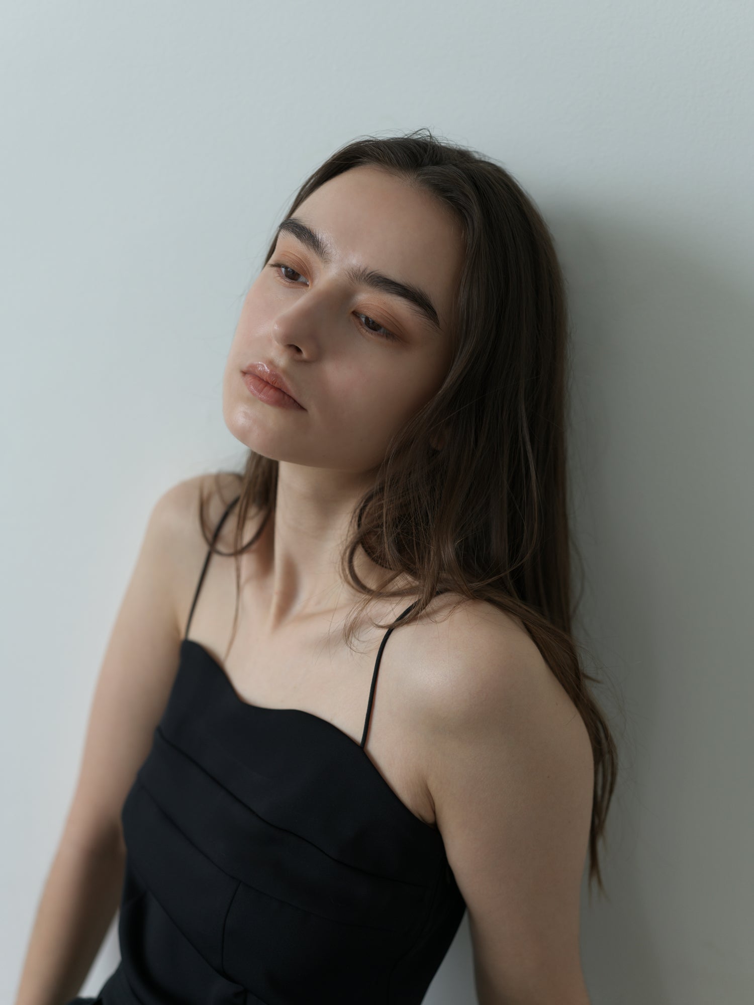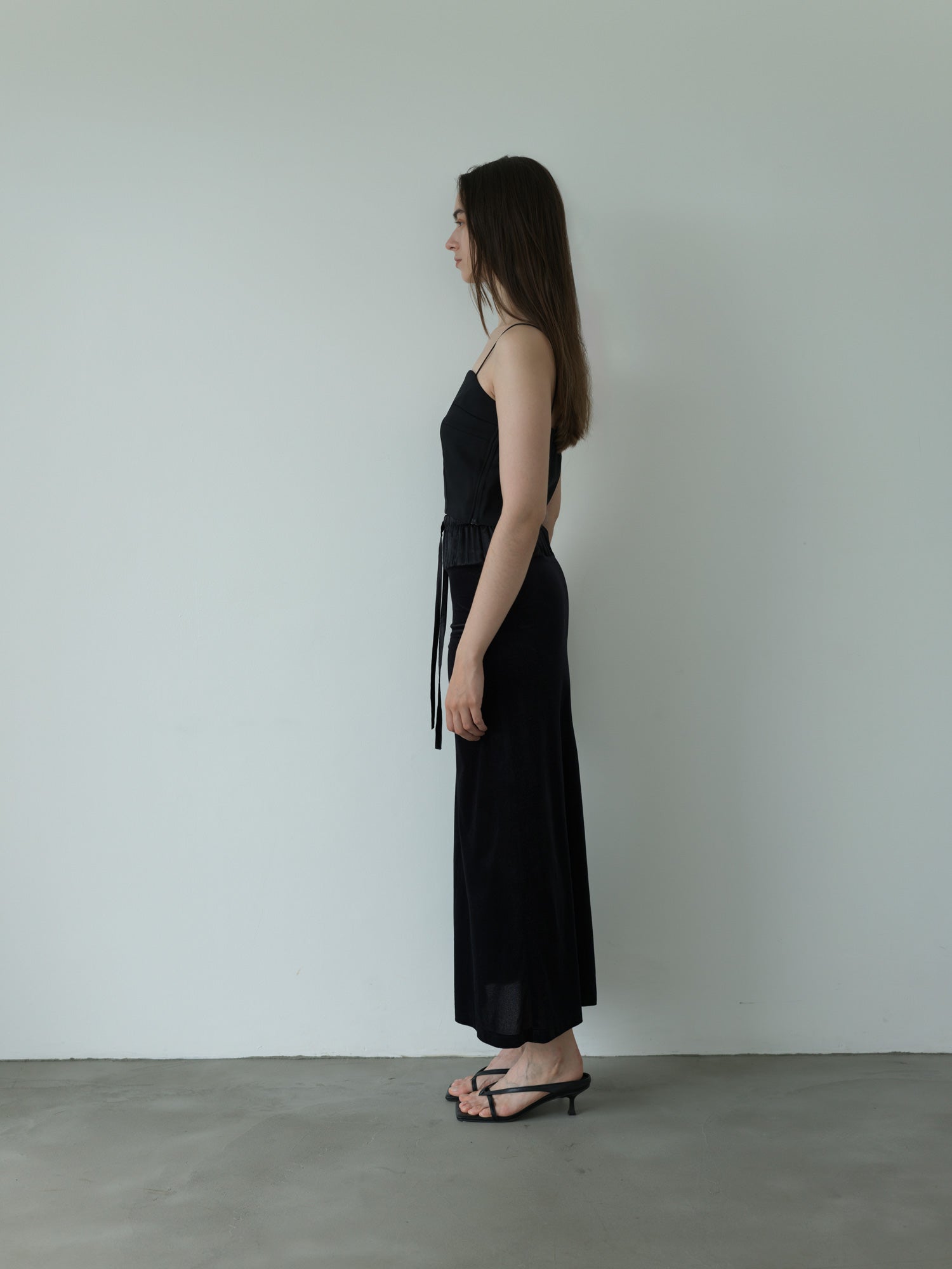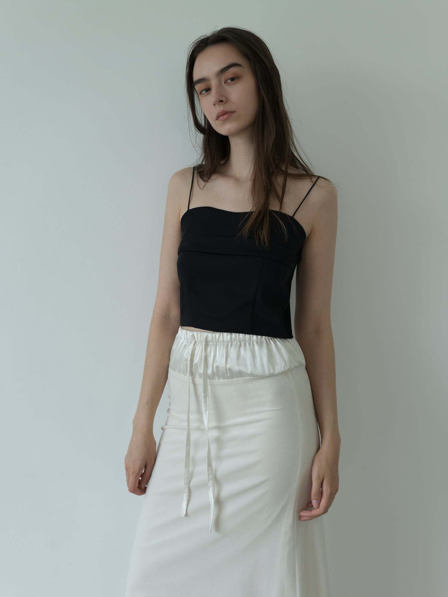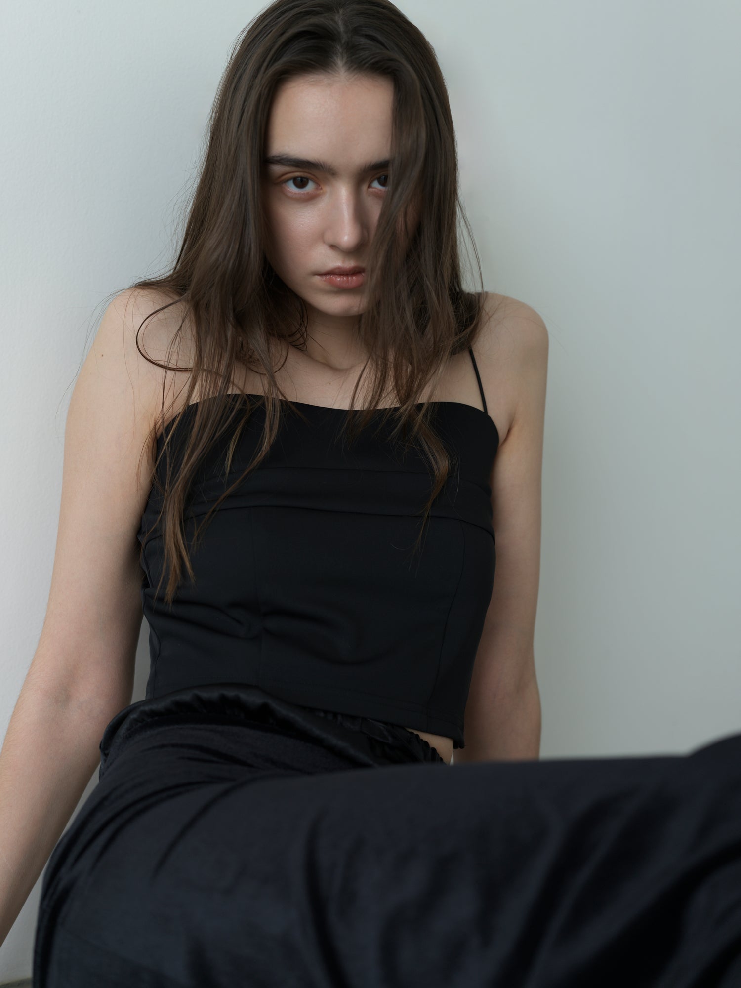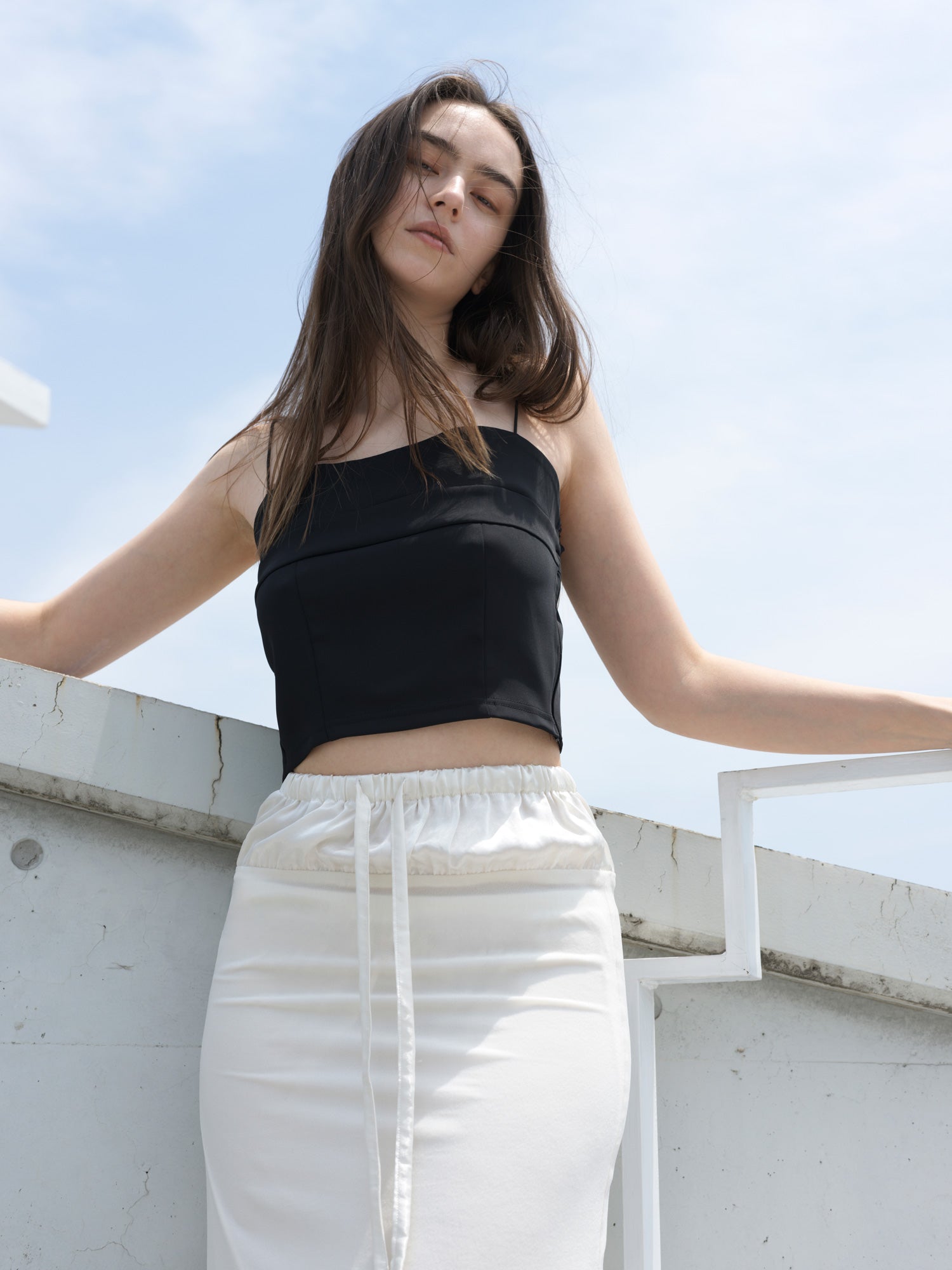 軽やかな素材を使用したキャミソール。ビスチェのような切り返しのデザインでありながらもボーンなどは使用していないので華奢に見せてくれますが、身体のラインがでにくいのもポイント。胸元も谷間が見えにくい高さに設定しているので、デイリー使いしやすいアイテムです。