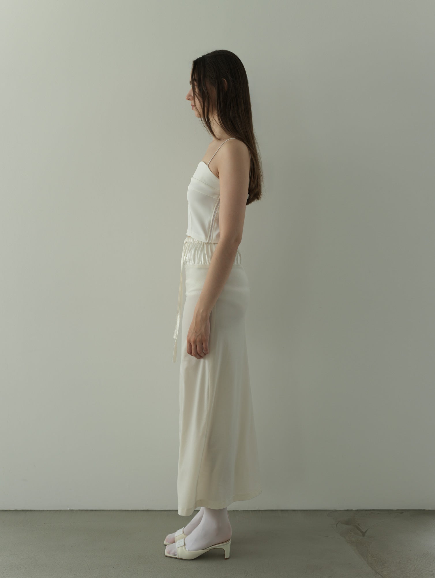 軽やかな素材を使用したキャミソール。ビスチェのような切り返しのデザインでありながらもボーンなどは使用していないので華奢に見せてくれますが、身体のラインがでにくいのもポイント。胸元も谷間が見えにくい高さに設定しているので、デイリー使いしやすいアイテムです。