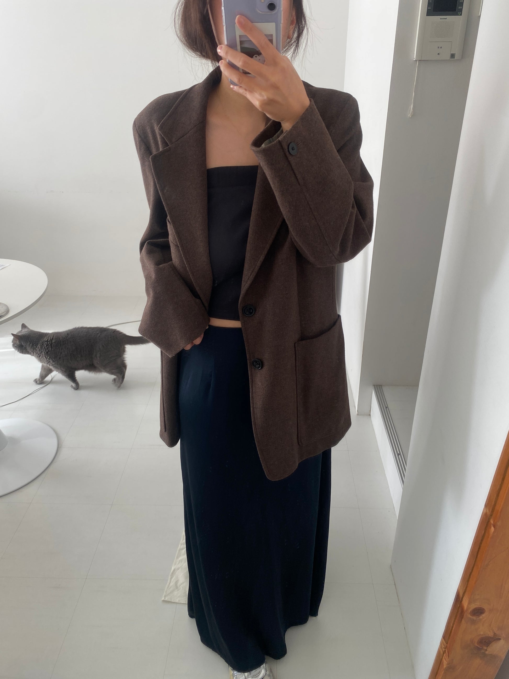 お素材はスエード素材で、ラフに着られるよう、身体のラインを拾いすぎない素材を使用しました。